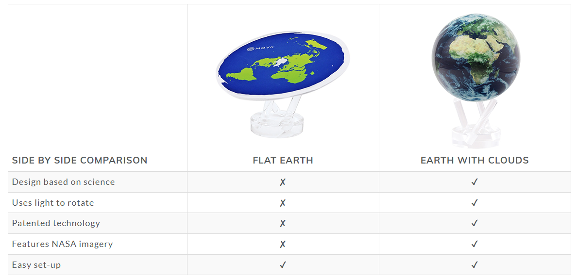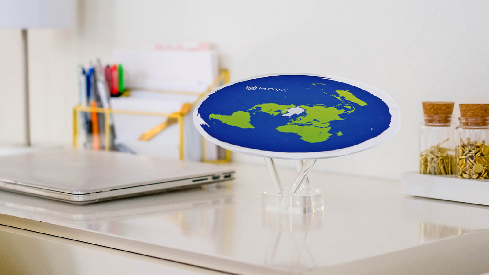 The Flat Earth MOVA Globe removes science and facts from the conversation to better represent the world we all live on. Behold an Earth that does not spin and is not spherical. Matter of fact, it’s flat as a pancake. Unlike other MOVA Globes that turn thanks to hidden magnets and solar technologies, the Flat Earth MOVA Globe is freed from traditional laws of physics like magnetic fields and gravity.