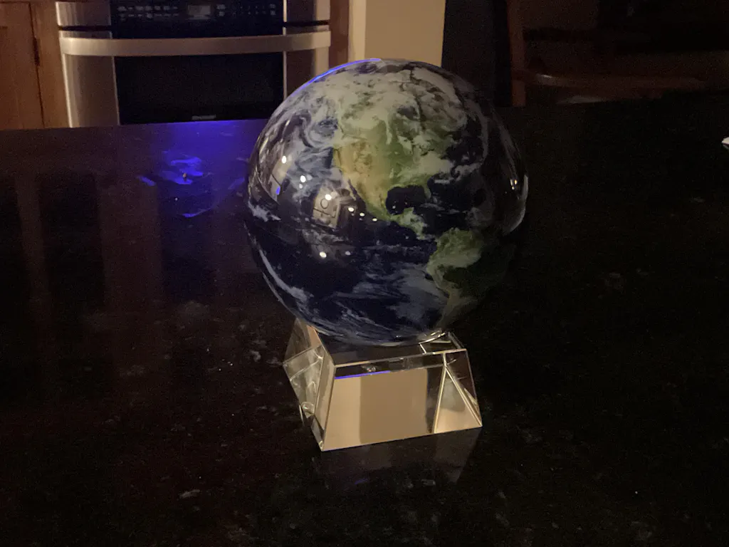 Each globe combines vibrant artwork with our patented technology, creating a flawless rotation without batteries or messy cords. Hidden solar cells use ambient natural or artificial light for power, while the earth’s magnetic field provides the necessary torque. These elements work seamlessly to power a 'whisper-quiet' mechanism, allowing the globe to rotate within its clear outer shell. Each piece is assembled with such precision, it appears the inner and outer layers are one – rotating without any outside power source.